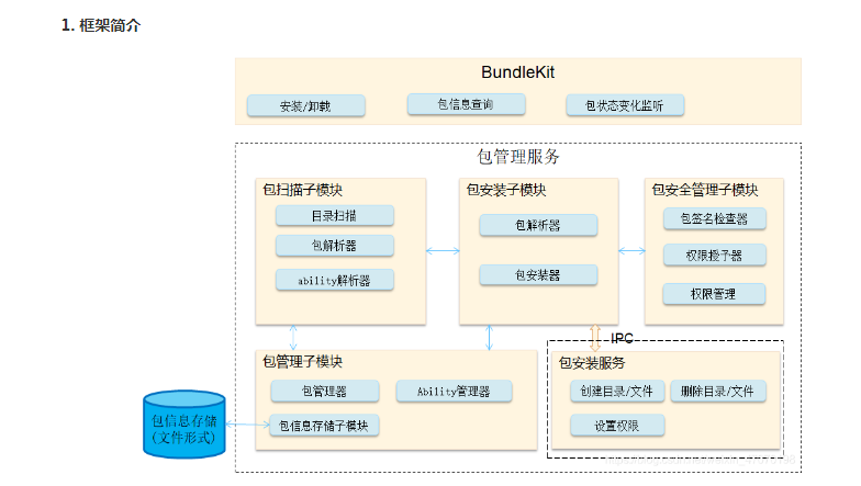 包安装子模块:安装,卸载,升级软件包;软件包安装服务是一个单独的过程,用于创建和删减有着较高权限的安装目录。 ·包管理子模块:管理与安装程序包相关的信息,储存持久性程序包信息。 ·包安全性管理子模块:署名检验,权限授予,权限管理。