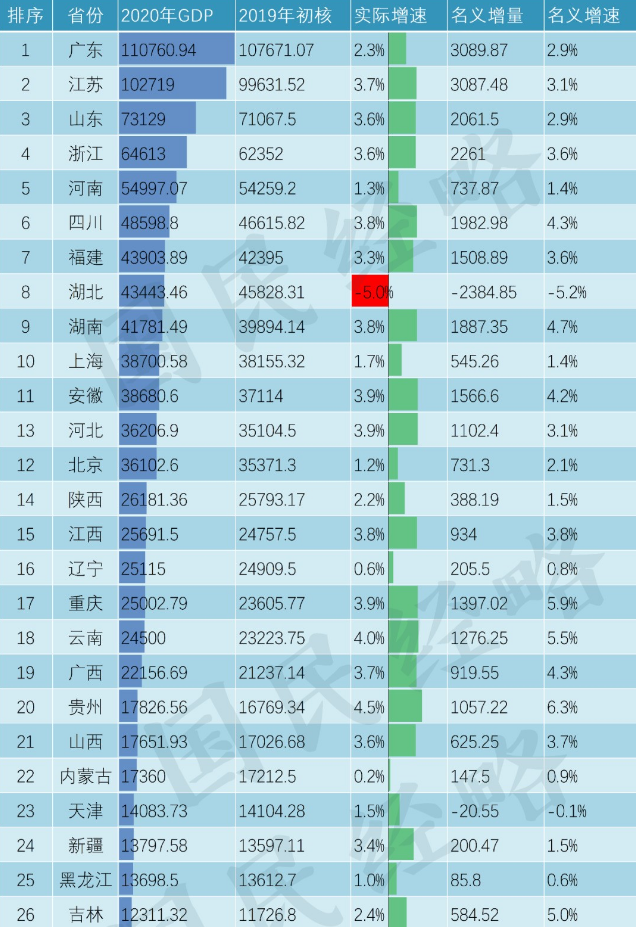 2020年,疫情冲击之下,中国经济逆势转正,成为唯一正增长的主要经济体。由于疫情冲击不一,各省市经济发展情况不一,省域经济发生了巨大变化。